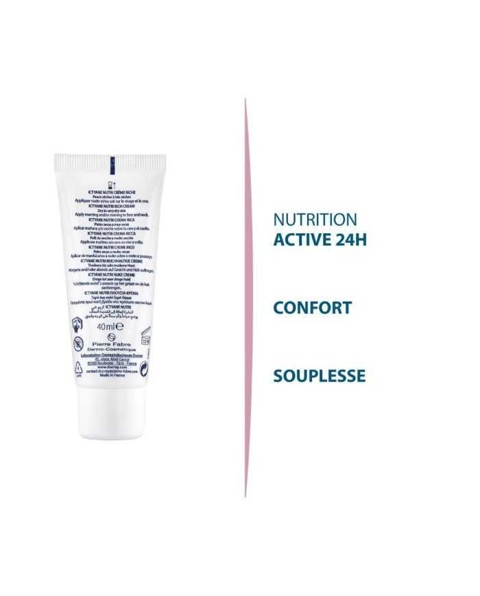 La crĂšme riche visage ICTYANE NUTRI est un soin visage nutritif Ă destination des peaux sĂšches Ă trĂšs sĂšches âą Elle nourrit durablement la peau tout au long de la journĂ©e et empĂȘche l’eau de s’Ă©vaporer âą Une texture veloutĂ©e et onctueuse qui pĂ©nĂštre rapidement et ne colle pas âą ProfondĂ©ment nourrie, la peau retrouve toute sa douceur et sa souplesse